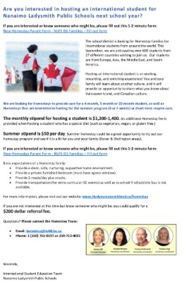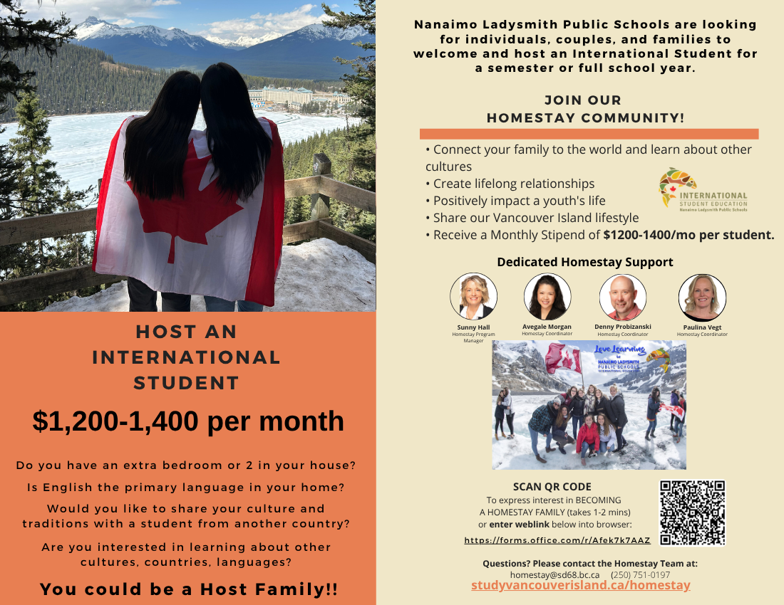 Nanaimo Ladysmith Public Schools are seeking local families, couples, and individuals to host a visiting International Student.